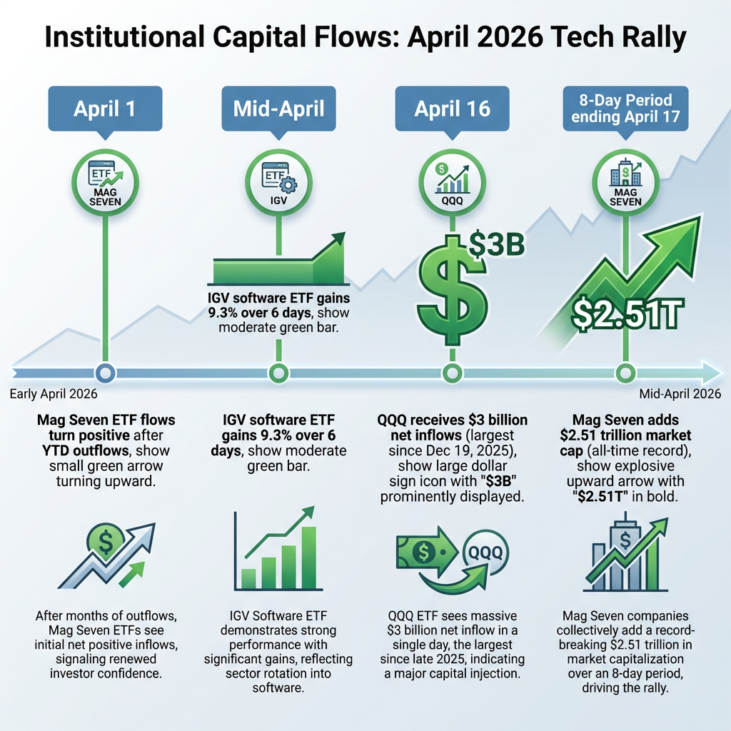 - QQQ recorded $3 billion in single-day net inflows on 16 April 2026 and the Magnificent Seven added $2.51 trillion in market cap over eight days, signalling institutional capital returning to semiconductor-heavy mega-cap tech names.