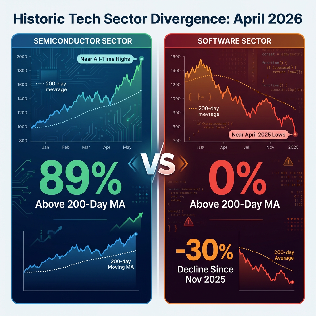 - Semiconductors and software stocks have reached a historic technical divergence, with 89% of semiconductor stocks above their 200-day moving averages versus 0% for S&P 500 software stocks in April 2026.