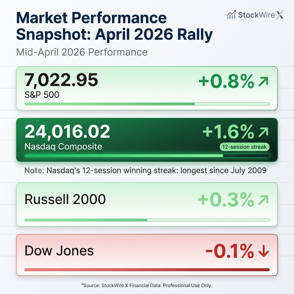 The S&P 500 reached 7,022.95 on Wednesday, climbing 0.8% to reclaim its January 2026 high after a late March correction that saw the index fall 10%. The Nasdaq Composite advanced 1.6% to 24,016.02, capping a 12-session winning streak, the longest such run since July 2009. Yet investor sentiment remained notably cautious, a disconnect that market analyst Paul Hickey described as revealing. “The equity markets convey a far more positive outlook than prevailing news coverage suggests,” Hickey told CNBC in mid-April.