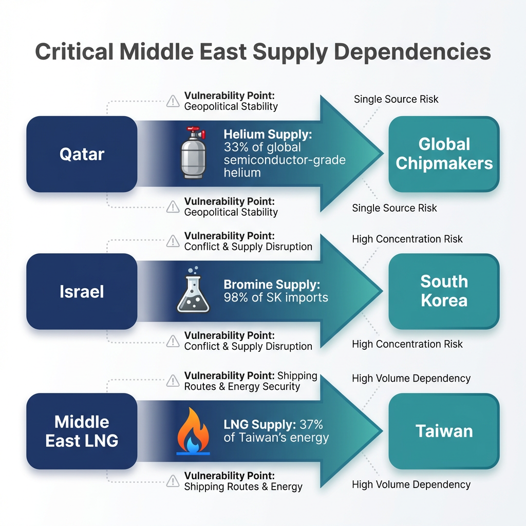 Three critical dependencies connect Middle East stability to global chip supply: