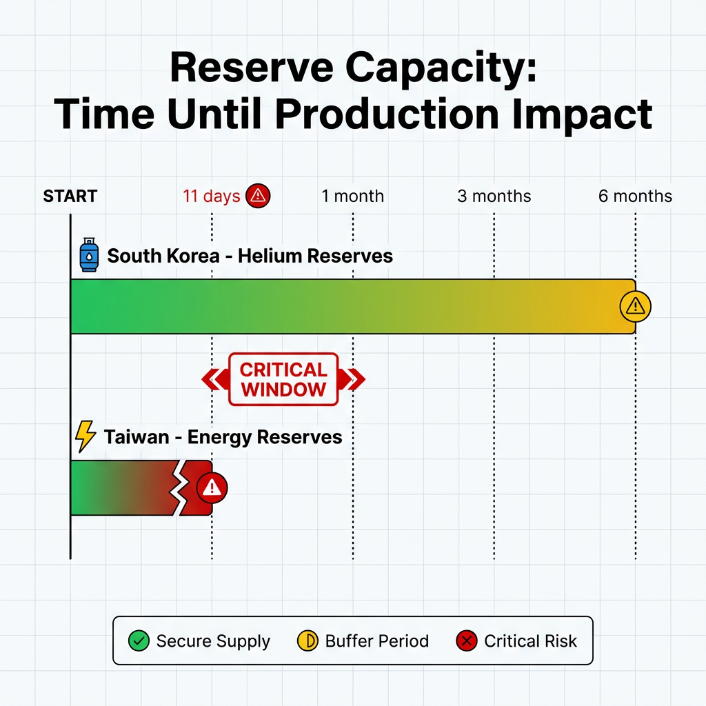 > South Korea maintains 6 months of helium reserves, whilst Taiwan holds only 11 days of energy reserves, creating vastly different vulnerability timelines across the supply chain.