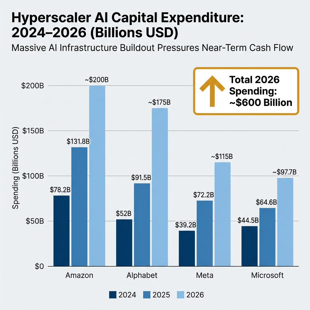 - Hyperscalers including Amazon, Alphabet, Meta, and Microsoft are projected to deploy approximately $600 billion in AI infrastructure during 2026, nearly double their 2025 expenditure, pressuring near-term free cash flow metrics.