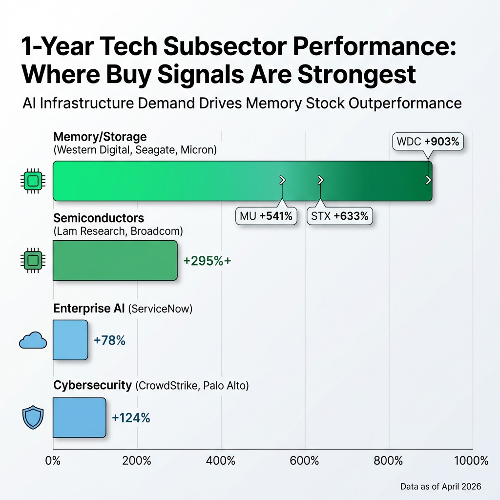 - Memory and semiconductor subsectors show the strongest buy signals, with Micron projecting 604% EPS growth, a forward P/E of 7.83, and one-year price gains of up to 903% for Western Digital.