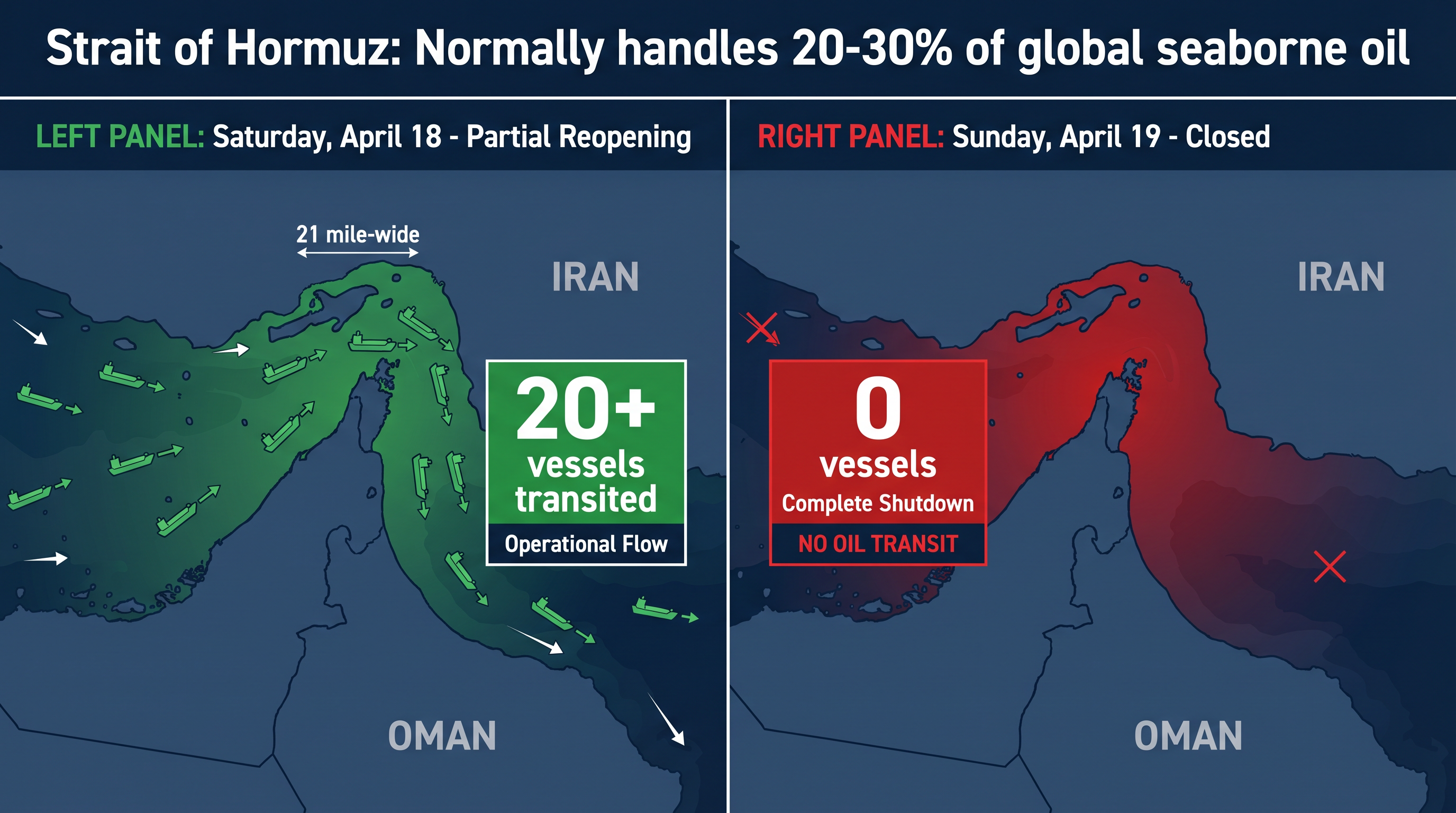The Strait of Hormuz is a 21-mile-wide channel between Iran and Oman. Approximately 20-30% of global seaborne oil trade transits this waterway under normal conditions. On April 19, that figure was zero.