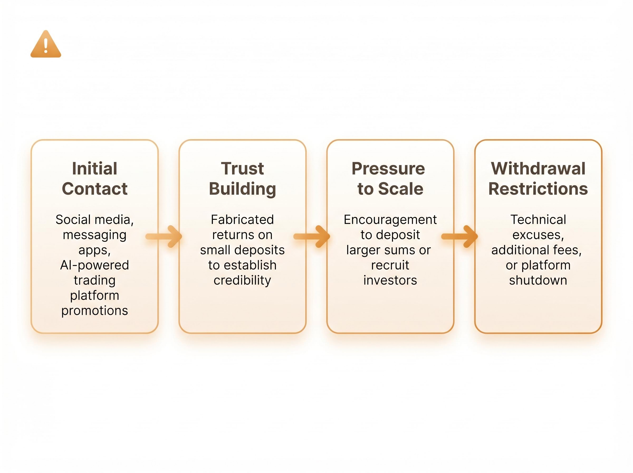 - Pressure to scale with operators encouraging victims to deposit larger sums or recruit additional investors