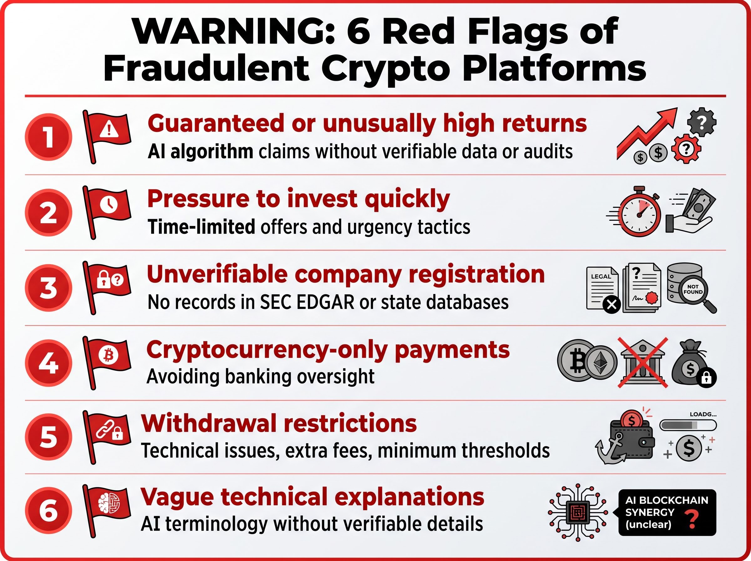 The Washington enforcement action and similar cases reveal consistent warning signs that investors can use to identify fraudulent platforms before committing funds. These red flags appear across AI-themed crypto scams regardless of specific platform branding or marketing approaches.