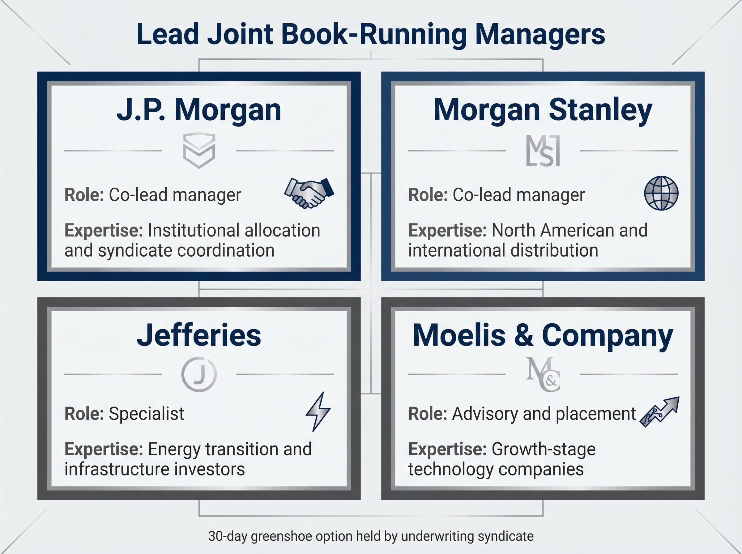 Four banks served as lead joint book-running managers for the offering: J.P. Morgan, Morgan Stanley, Jefferies, and Moelis & Company. The book-runner role places these firms at the centre of the IPO process, responsible for building the order book, advising on pricing, allocating shares to institutional investors, and stabilising the stock in early trading if needed.