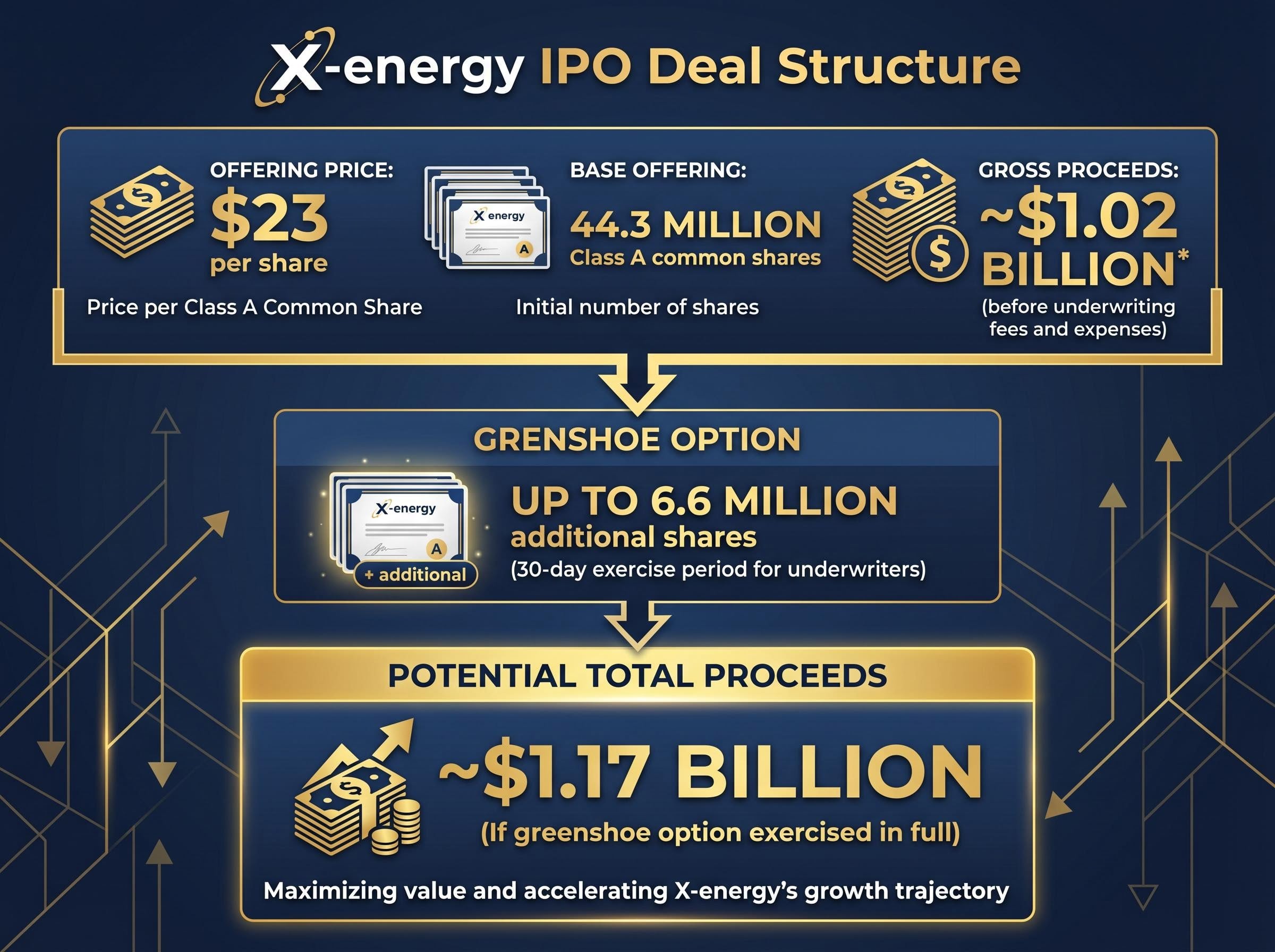 X-energy raised approximately $1.02 billion in gross proceeds before underwriting fees and expenses by selling 44.3 million Class A common shares at $23 each. If underwriters exercise their full greenshoe option of up to 6.6 million additional shares, total gross proceeds could rise to approximately $1.17 billion.